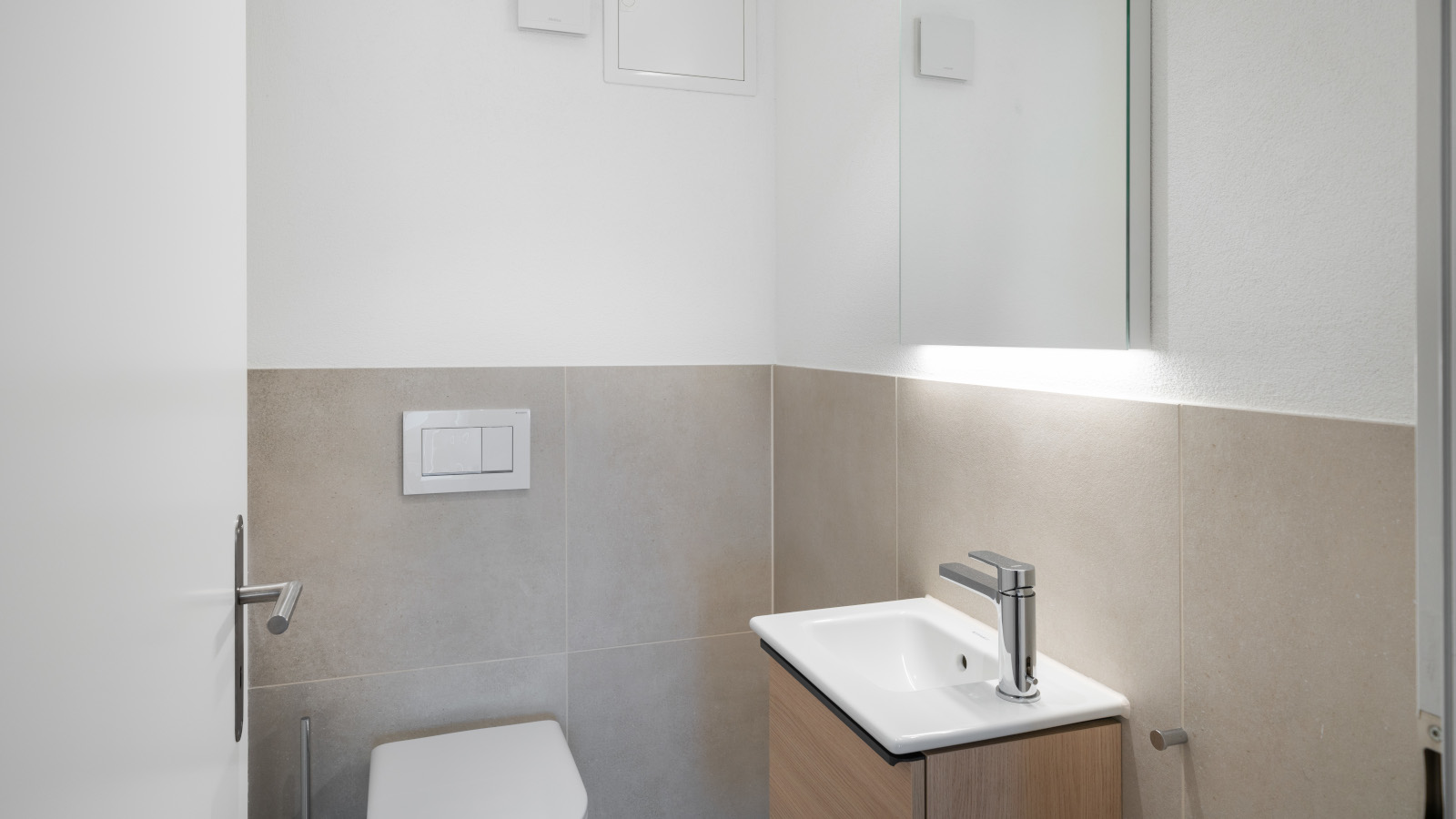 Es sind drei Badezimmer vorhanden. Ein Badezimmer ist ausgestattet mit WC, Waschtisch und Dusche, eines mit WC und Waschtisch sowie eines mit Dusche und Waschtisch.