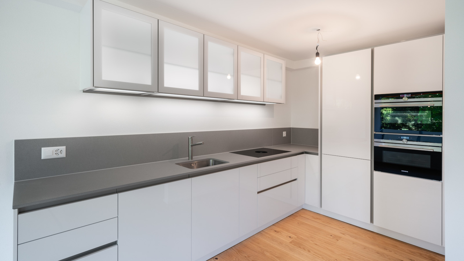 In der grosszügigen Wohnung gibt es ein offener Wohn-/Essbereich mit einer Küche. Die Küche ist ausgestattet mit einem BORA-Kochfeld mit integriertem Dunstabzug, Backofen und Steamer, Kühl-/Gefrierschrank sowie Arbeitsplatte und Rückwand aus Keramik.
