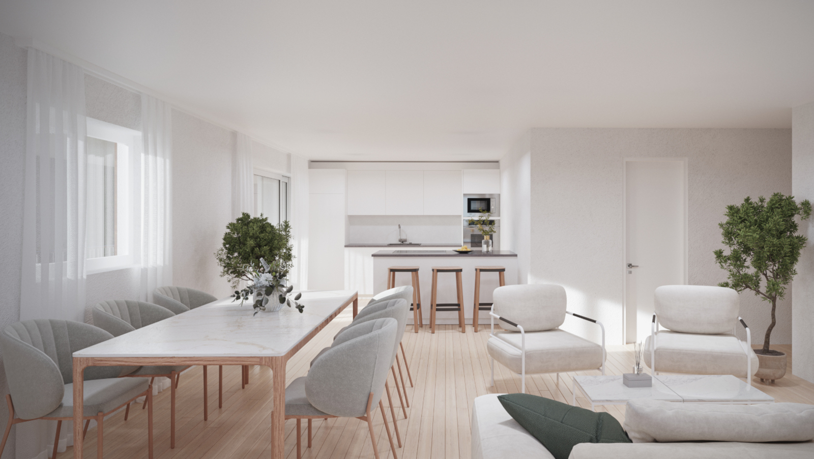 Im Inneren des Gebäudes erwartet die zukünftigen Bewohner ein durchdachtes Wohnkonzept, das höchsten Wohnkomfort bietet. Jede Wohnung verfügt über einen offenen Wohnraum, der fließend in den Essbereich übergeht und so eine großzügige und einladende Atmosphäre schafft.